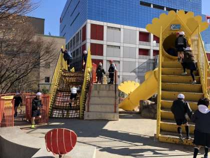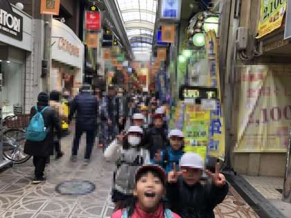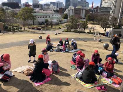今昔館の見学後は天神橋筋商店街をとおって、扇町公園へ行きました。寒空の下ですが、子どもたちは楽しくご飯を食べました。その後は少し公園で遊びました。楽しく学べる社会見学となりました。