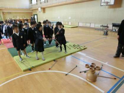韓国の伝統衣装の「チマチョゴリ」や太鼓の「チャンゴ」の実物を見せてもらったり、伝統遊びの「トゥホ」、韓国こま「ペンイ」で実際に遊びました。