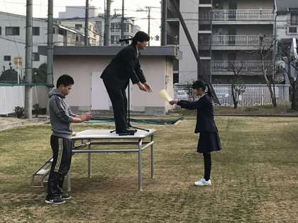 大阪市ポイ捨て禁止こどもポスターコンクールで、6年生の松尾実莉さんの作品が、教育委員会教育長賞に選ばれました。先日、市役所で表彰がありました。松尾さんの作品は、大阪市を走るゴミ収集車に貼られています。今度、ご覧になってください。