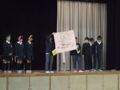 インフルエンザのため、久しぶりの児童集会は給食委員会の発表となりました。児童が疑問に思っていることを劇を通して、解説してくれました。劇はとてもわかりやすく、面白かったので、児童から笑い声が自然とこぼれていました。この劇で、栄養の大切さを忘れず、好き嫌いなく給食を食べてほしいですね。