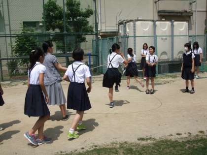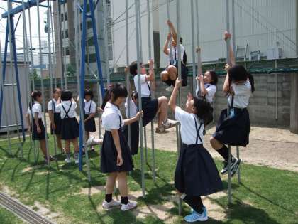 東運動場ではサッカーやドッジボールを楽しんでいます。5年生は毎日のぼり棒の練習をしています。6年生も長なわを楽しんでいます。