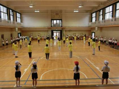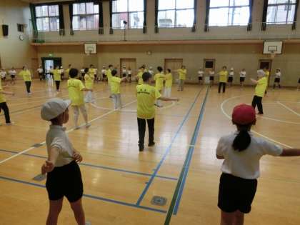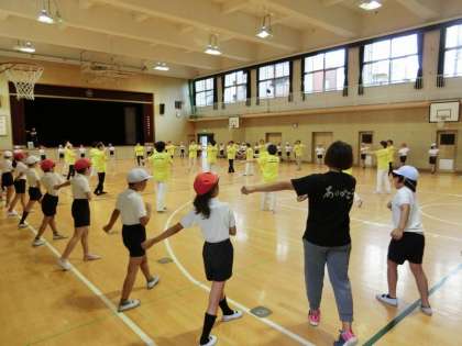 今年は河内音頭だけではなく、「アラレちゃん音頭」と「ダンシングヒーロー」にあわせた踊りも教えていただきました。暑い体育館の中でしたが、すてきな音楽と楽しい踊りで児童も自然と笑顔になっていきました。今日の踊りは関目まつりや運動会で披露されます。