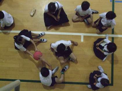 ボールを回して、笛の合図でボールを持っている人が、アウトとなり、円の真ん中に行きます。