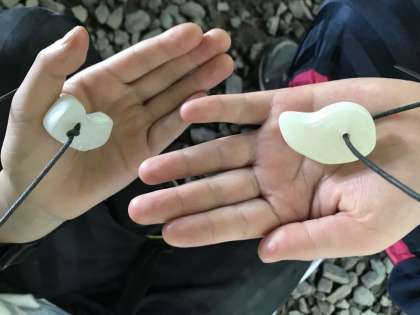 初めての挑戦で苦労する子もいましたが、みんな集中して石を削って素敵な作品に仕上げていました。紐を通してネックレスにしました。未完成の児童は家で続きを作ります。