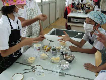 45分間で、身支度・準備・実習・試食・後片付けをしないといけないので、自然と協力して活動しています。