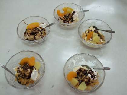 「フルーツポンチ」・「アイスチョコバナナ」・「サンドイッチ」・「パフェ」を実習しました。
