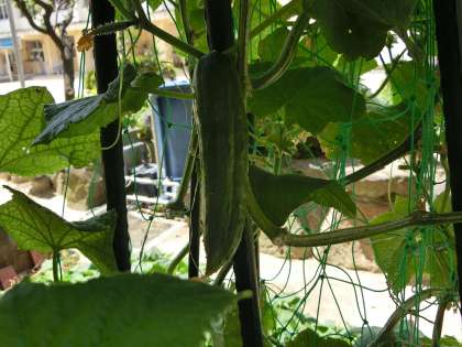 なかよし教室前に、プランターで野菜を育てています。量は少ないですが、いい天候のおかげで、なすびとキュウリ、ピーマンが実りました。