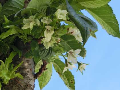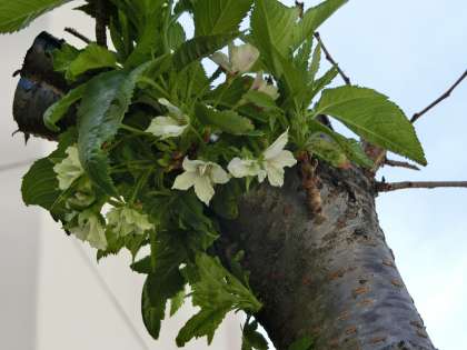 3日間の学校閉庁日も終わり、校庭の桜の木をふと見ると、いくつも花が咲いていました。真夏なのに不思議ですね。
