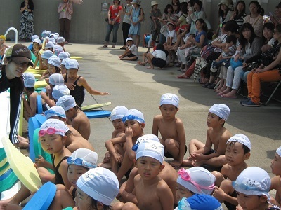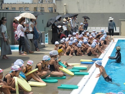 今年から始まった1・2年生合同プール授業の様子を参観していただきました。
