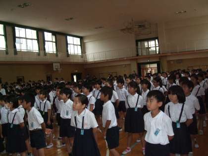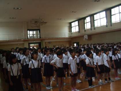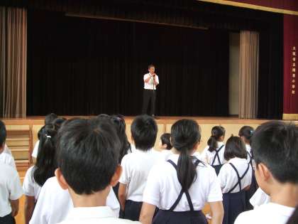 運動場の芝生が養生期間に入ったので、今日の児童朝会は講堂で行いました。