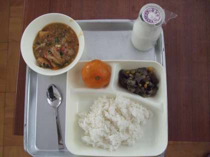 今日の献立は、トマトのマーボー厚揚げ、ゴーヤととうもろこしとなすのガーリックソテー、冷凍みかん、ご飯、牛乳です。これは、学校給食献立コンクール優秀賞作品です。「夏ばて防止!!見ても食べても元気いっぱい!!」をテーマに考えられたようです。