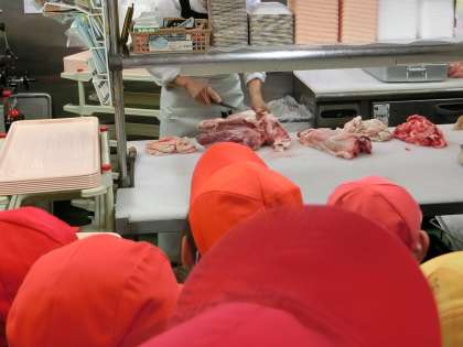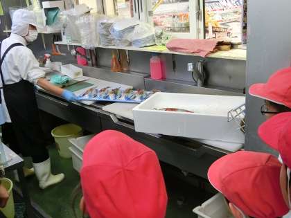 肉や魚を切って、すごい手さばきでパッケージングされ、児童は驚いていました。最後に店長さんへいろいろな質問をして、答えてもらいました。