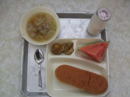 今日の給食は、スパイシーチキン、ウインナーとじゃがいものスープ、すいか、パン、牛乳でした(*^_^*)
