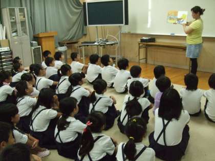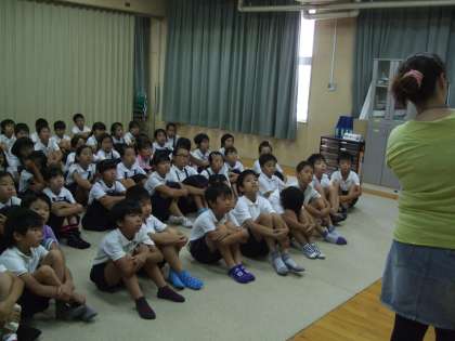 4年生は、2クラス一緒に多目的室で読んでいただきました。
