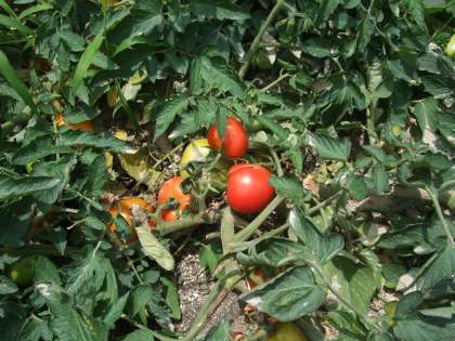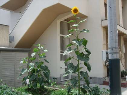 ぐんぐん伸びていたヒマワリの花が咲いています。また、トマトが色づき