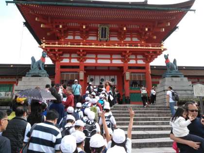 日本の中でも人気の高い観光地でなので、たくさんの外国人の観光客が来ていました。伏見稲荷大社は稲荷山にあり、標高約233メートル、一周約4キロで、児童は2時間ほどかけて歩きました。
