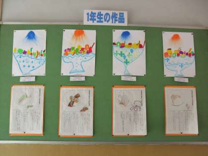 「おいしいフラッペ」と国語科で学習した「身の守り方紹介カード」を掲示しています。