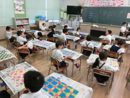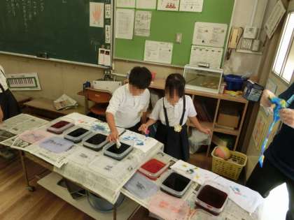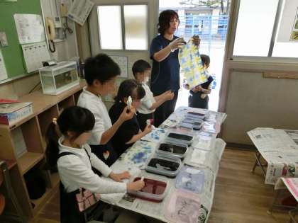 障子紙をうまく折り、すきな色を3色選んで、着色していきます。色をつける量や場所などで同じ色を選んでいても全く違った雰囲気になるので、児童はどのおりぞめにも「おぉ〜!」という感嘆の声をあげていました。