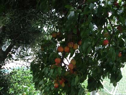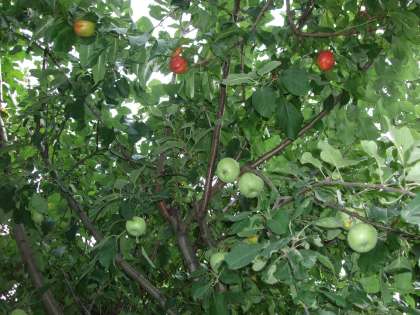 芝生運動場の東側に果樹園があります。今スモモがたわわに実り、リンゴも