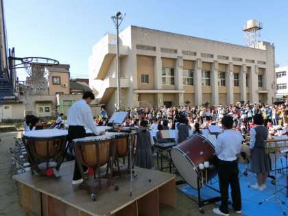 数年ぶりの開催となりましたが、本校卒業生がたくさん所属しているだけでなく、レベルの高い演奏とあって、1曲目から参加者の心を惹きつける内容となりました。また開会式のファンファーレも披露してくれました。