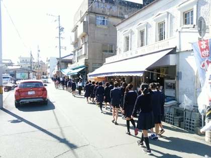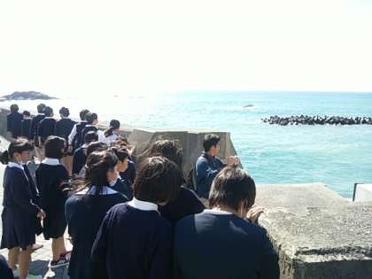 バスから降りると少し肌寒く感じる潮風が児童を迎えてくれました。灯台に上がる坂道は少し急ですが、きれいな景色を目指して登ります。
