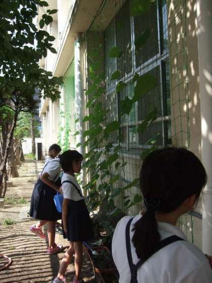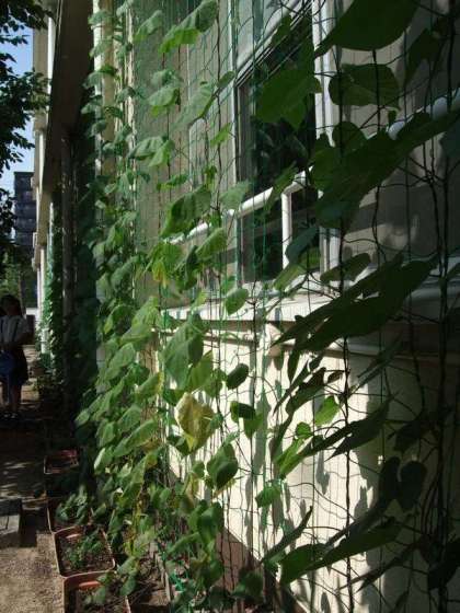 1年生の教室裏で育てているリュウキュウアサガオのつるがぐんぐんと伸びています。