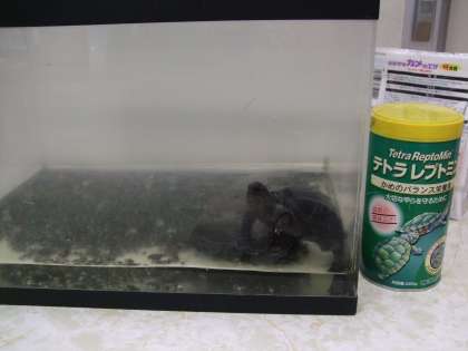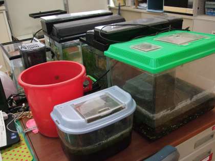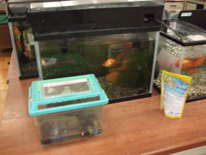 各学級で飼育しているカメや金魚などが職員室に引っ越しています。