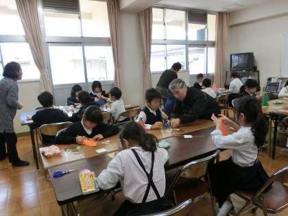 地域の生涯学習ルームの方に来ていただき教えてもらいました。用意してもらった型紙にシールやかわいい模様の飾りをつけました。
