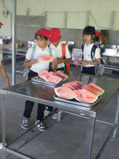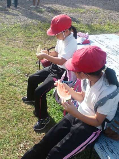 午後からのオリエンテーリングでも大きなケガがなく、宿舎にもどって用意されたスイカを口一杯に頬張っていたとのことです。