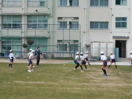 前にパスができないルールに戸惑いながら対戦していました。初めてのタグラグビーで少し難しい場面もありましたが、楽しんで活動をすることができました。