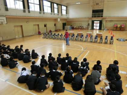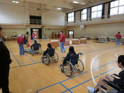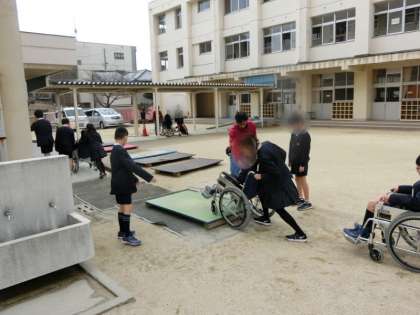 まず講堂で車いすを動かし、普段よりも動きにくいことや坂がしんどいこと、少しの段差でつまずいてしまうことを知りました。その後、実際に校舎や運動場へ出て、普段何気なく使っている場所でも、車いすにとっては移動が難しい場所にも気づくことができました。この学習を通して、児童の見る目線が少し変わったように感じます。