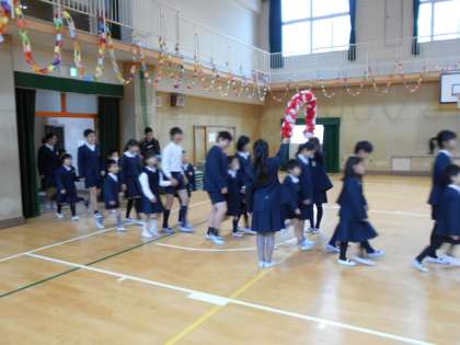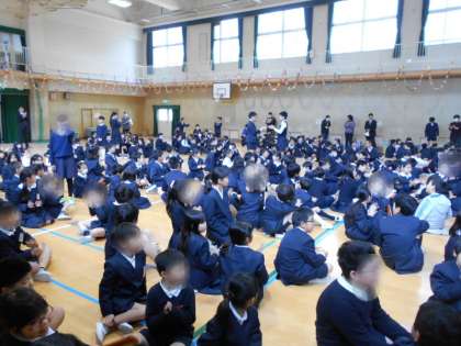 6年生の入場は入学式とは違い、1年生が6年生の手を取って、入場しました。その後、6年生との最後の児童集会を行い、〇×ゲームをしました。学校全体で楽しい時間を過ごしました。