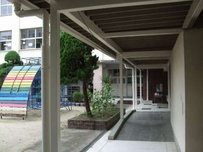 給食室横の渡り廊下の塗装作業が終わり、きれいに仕上がっています。