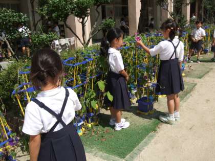 生活科の学習で育てたアサガオの花を使って、押し花や色水作りをしました。