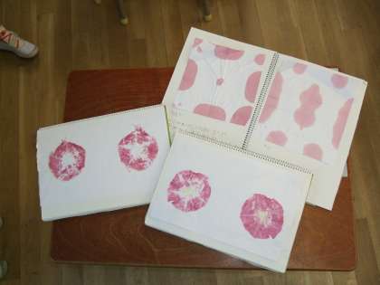 赤や青・むらさきのきれいな色水もできました。和紙を折りたたみ、たたき染めにも挑戦しました。ゆっくりと和紙を広げていくと不思議な模様ができていました。