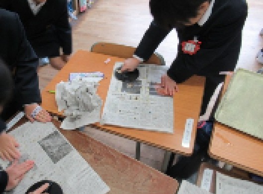 水で湿らした和紙を台紙にのせ、バレンでこすって転写します。