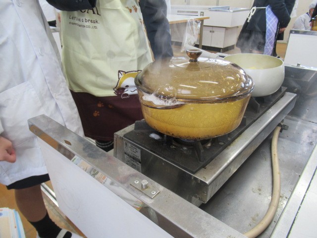 ご飯はガラスの鍋を使って水の量や火加減に気を付けながら炊きました。