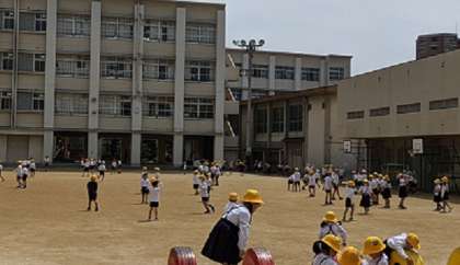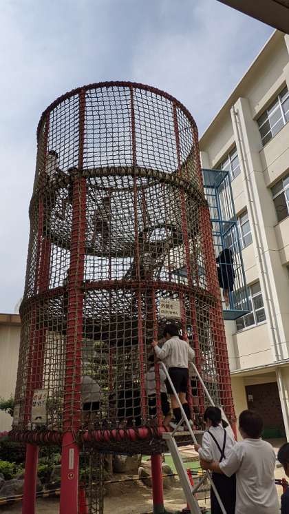 鯰江小学校には、タイヤや鉄棒など遊具がいっぱい!中庭にはネットジムがあり、先生たちが見守りながら、安全に気をつけて遊びます。