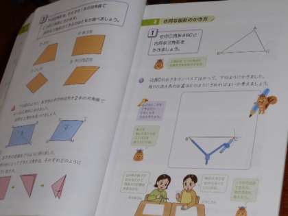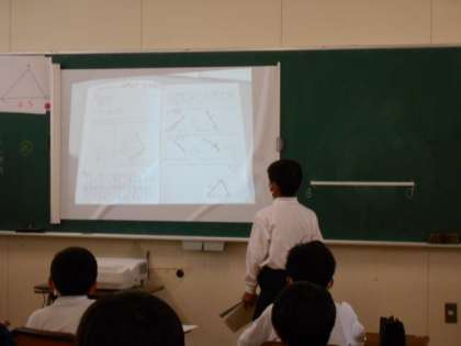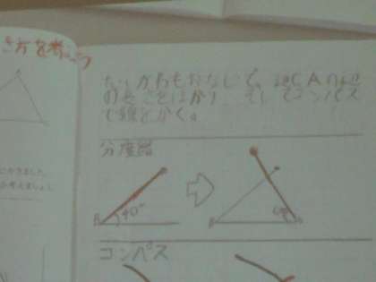 3点の位置が決まればかくことができるので、角度をはかったり、コンパスで長さをはかり取ったりと 工夫して作図することができました。