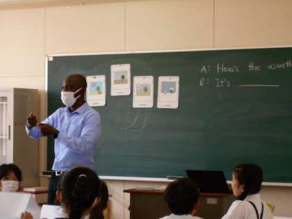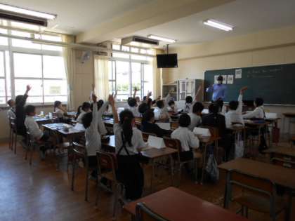 発表した子に「Good〜!」「Nice〜!」と笑顔で答えるフランク先生のリアクションに大喜びの子どもたち。もっと発表したいとたくさん手が挙がります!