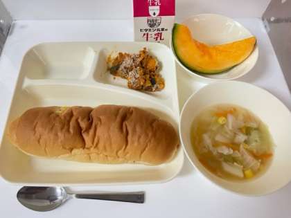 かぼちゃのミートグラタン、鶏肉と野菜のスープ、クインシーメロン、おさつパン、牛乳