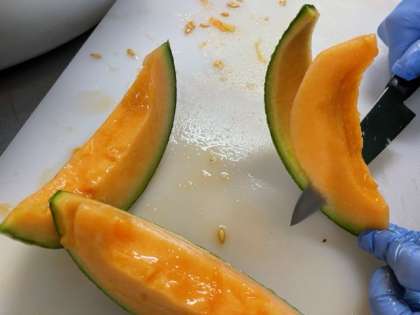 クインシーメロンが74個届きました。ひとつずつ種を取り、児童が食べやすいように切り方を工夫してくれました!