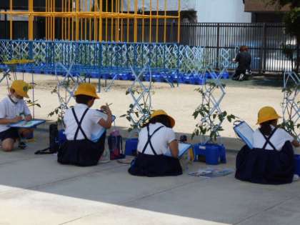 「お花咲いてるねん」と嬉しそうに教えてくれる子やにおいや手触りなども感じて一生懸命かんさつカードをかいている子がいました。