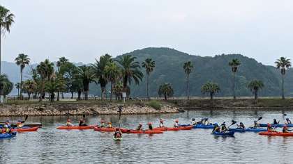 前の人が左側を前に進み、後ろの人が右側をバックで漕ぎます。