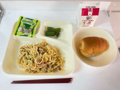 和風焼きそば、オクラの甘酢あえ、まっ茶大豆、1/2黒糖パン、牛乳