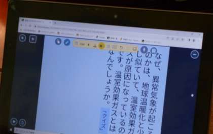 環境問題について、各テーマごとにタブレットを使って自分たちで資料を集め、まとめています。