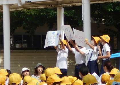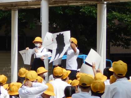 1年生から6年生の子どもたちがよく借りている本や図書室にある本の登場人物をシルエットクイズにして3択クイズを出してくれました