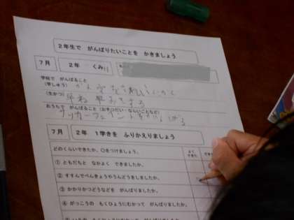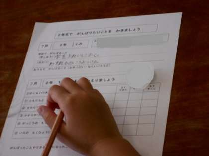 2年生でがんばりたいことの目標を立て、1学期の最後にその振り返りをしています。