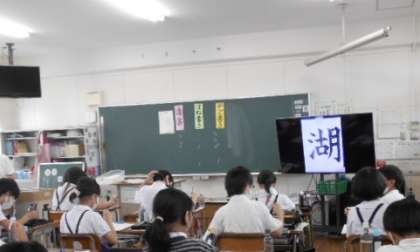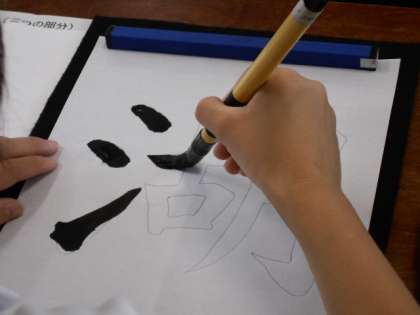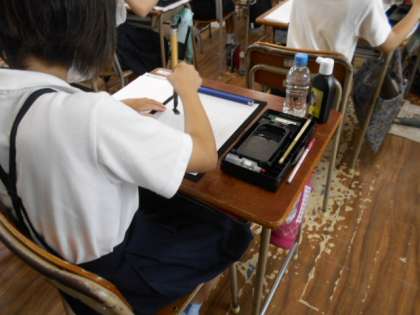 背筋を伸ばして床に両足の裏をしっかりつけて筆を立てて・・・