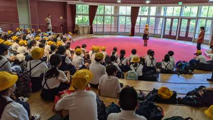 代表の児童が林間のめあてをお話しました。宿舎の方からのオリエンテーションでベッドメイキングについて説明がありました。